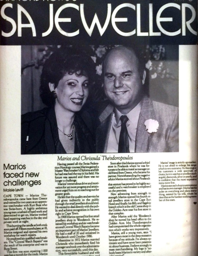 Marios took it upon himself to leave his family at the tender age of sixteen to pursue a better life elsewhere, and chose to emigrate to Cape Town, South Africa. He was blessed to come across a highly talented Swiss watchmaker Kurt Busa who took him on as his apprentice and trained him up to be a fully fledged watchmaker. Marios worked for Kurt Busa for two years and during this time he met his beautiful supportive wife, Chrisoula. Marios and Chrisoula discovered that they had sharp entrepreneurial instinct and made the decision to set off on their own and establish a jewellery retail store in Woodstock and from there they gradually created a retail network of five stores around Cape Town. As the years went by, they decided to scale down their business and today they own one exquisite store in Canal Walk, Century City.