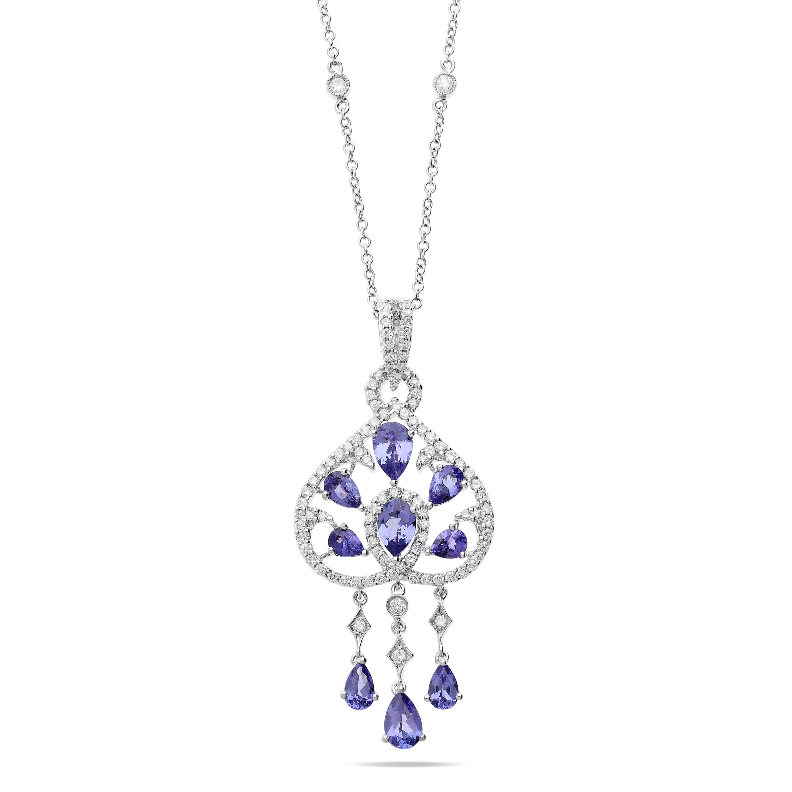An 18ct white gold antique inspired chandelier pendant set with pear shaped tanzanite gemstones surround with an elegant swirl of diamonds, suspended onto a rolo link chain with diamond accents.