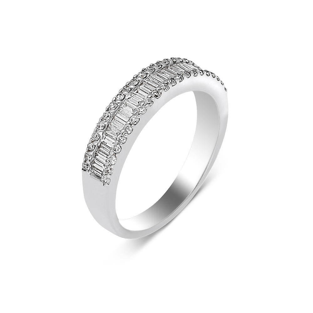 An 18ct white gold fancy three row eternity ring with baguette cut diamonds in the centre offset with round cut diamonds on either side.