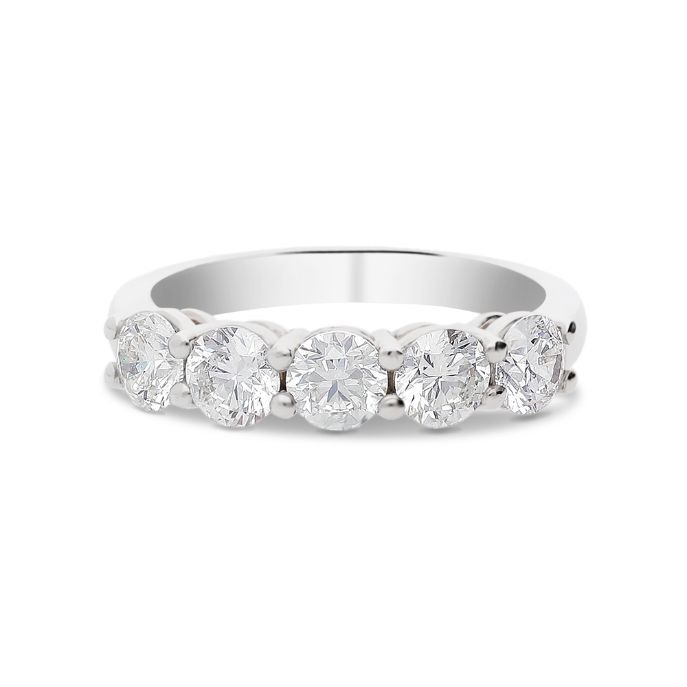 An 18ct white gold half eternity ring set with five round brilliant cut diamonds secured in a classic 4-prong setting.