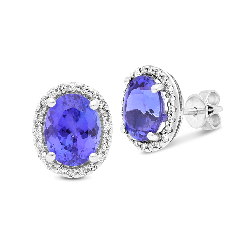 A pair of 18ct white gold stud earrings boasting oval tanzanite gemstones complemented with a halo of diamonds.