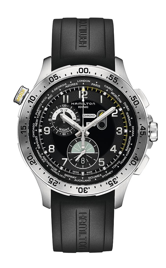 With a tradition of using feedback from pilots to develop our aviation timepieces, the Hamilton Worldtimer Chrono is a perfect example of how teamwork makes the dream work. Designed in collaboration with aerobatic pilot Nicolas Ivanoff, and powered by the specially developed H-41e chrono quartz movement, it can display or count time and even includes a second time zone.
